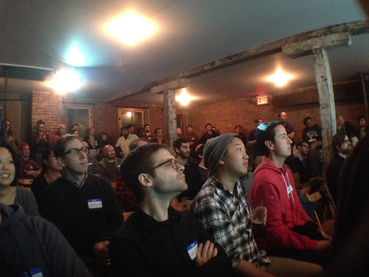 If you’re in New York and like beer, good people and good JavaScript, don’t miss BrooklynJS. You can see from the crowd shot it’s a popular night. So follow them on Twitter and jump on tickets early.